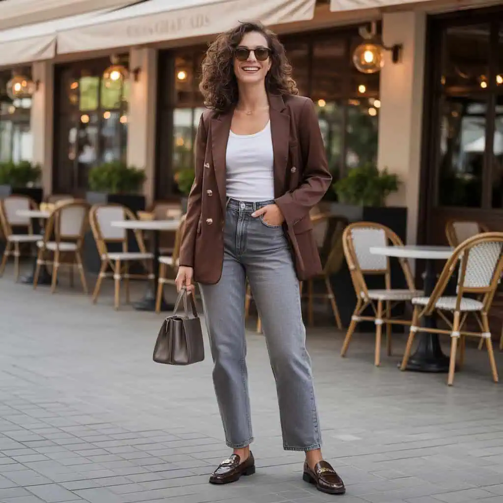 Le blazer chocolat associé à un jean gris est une combinaison facile à adopter au quotidien. Le blazer apporte une touche élégante, tandis que le jean conserve une allure décontractée.