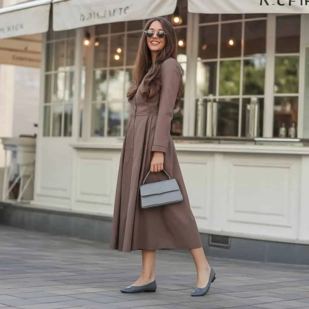 La robe marron cintrée associée à des ballerines gris ardoise est une combinaison simple mais très élégante. Le contraste entre ces deux teintes apporte douceur et modernité.
