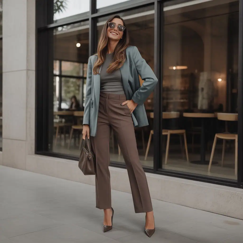 L’association d’un blazer gris ardoise structuré avec un pantalon chocolat crée une silhouette élégante et moderne. Le gris apporte une touche sophistiquée tandis que le chocolat réchauffe immédiatement la tenue. Ce contraste subtil donne une allure chic sans effort.