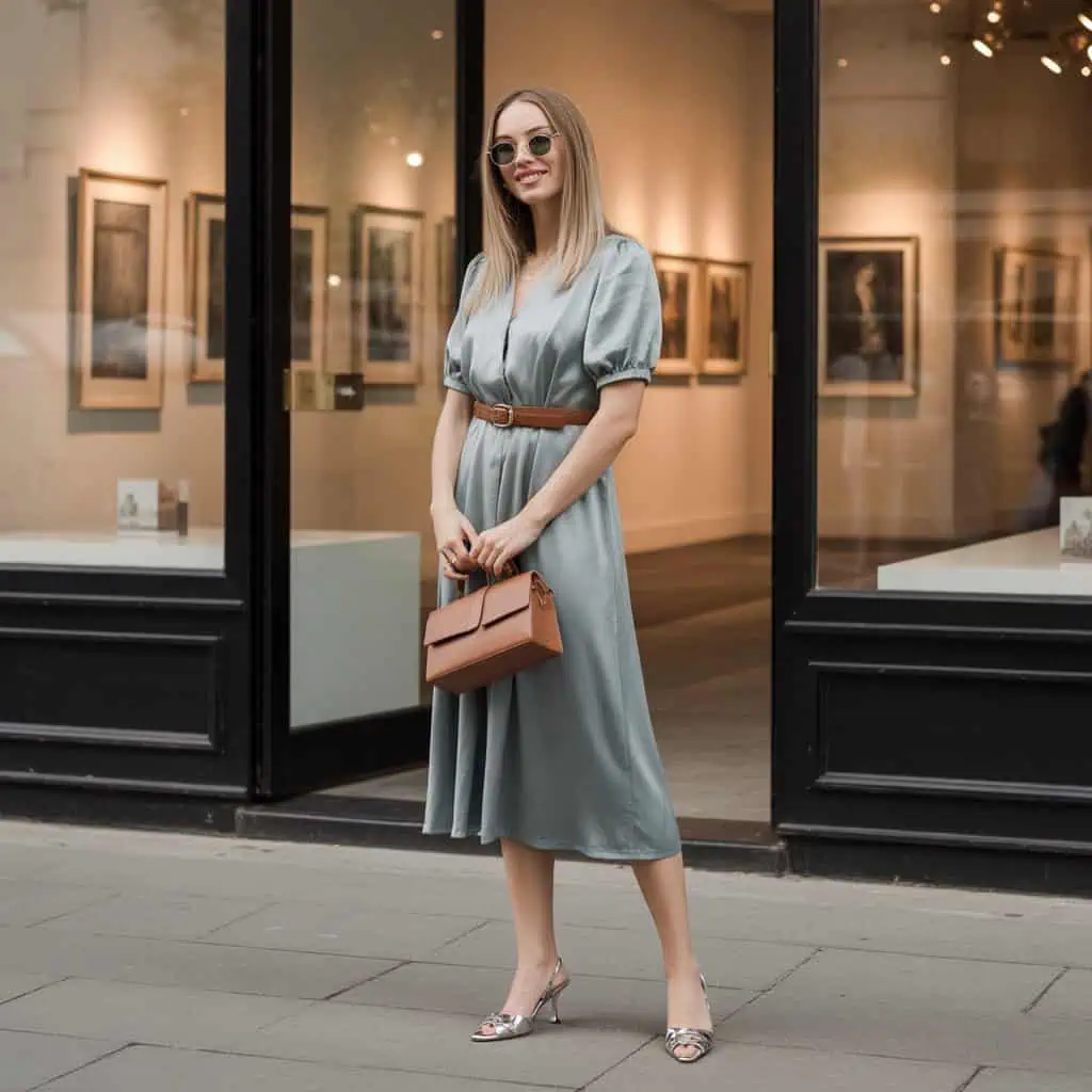 Une robe gris ardoise devient encore plus élégante lorsqu’elle est accompagnée d’accessoires marron. Ce mélange de teintes crée une harmonie naturelle et moderne.